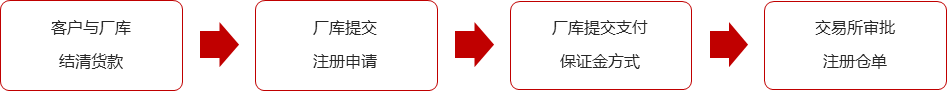 客戶與廠庫(kù)結(jié)清貨款等費(fèi)用后,廠庫(kù)通過(guò)交易所倉(cāng)單系統(tǒng)提交倉(cāng)單注冊(cè)申請(qǐng)。