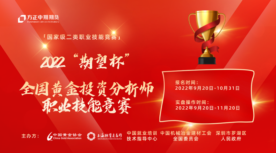 2022全國(guó)黃金行業(yè)職業(yè)技能競(jìng)賽——“期望杯”黃金投資分析師期貨實(shí)盤(pán)大賽為國(guó)家級(jí)二類職業(yè)技能競(jìng)賽,本次大賽由中國(guó)黃金協(xié)會(huì)、中國(guó)就業(yè)培訓(xùn)技術(shù)指導(dǎo)中心、中國(guó)機(jī)械冶金建材工會(huì)全國(guó)委員會(huì)、深圳市羅湖區(qū)人民政府、上海期貨交易所聯(lián)合主辦,上海金幣投資有限公司、世界鉑金投資協(xié)會(huì)協(xié)辦,方正中期期貨有限公司等期貨公司為指定交易商。